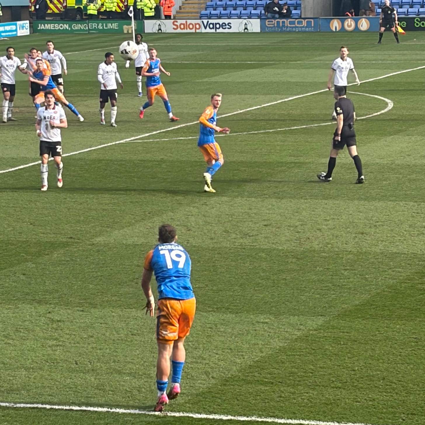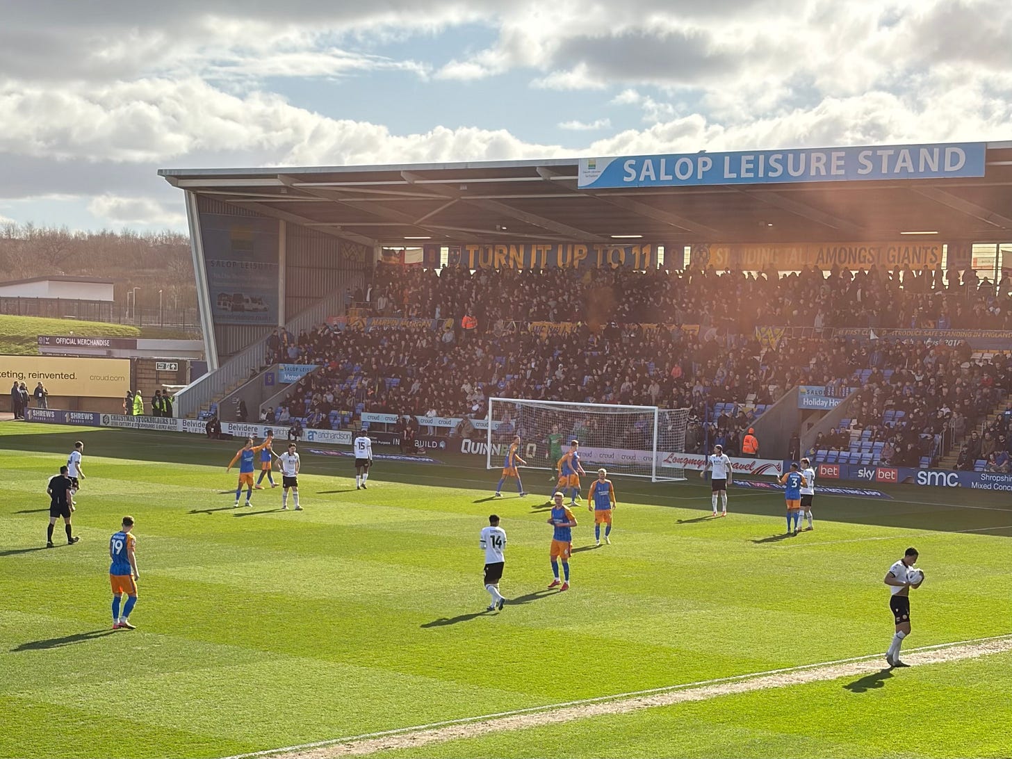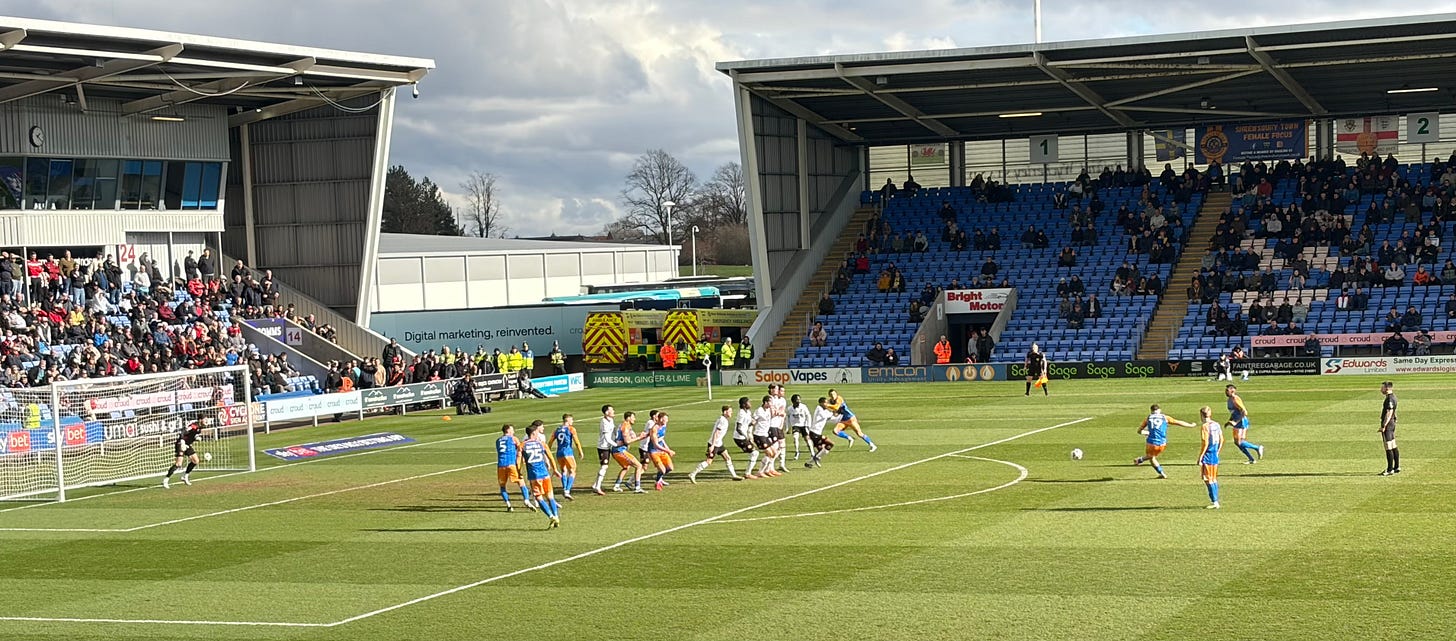 At the Supporters’ Parliament meeting a couple of days previous, Major Cowan had excused an early exit by saying that he still needed to work on his battleplan for the coming Saturday. His starting line up had been tweaked slightly from the eleven that had started at Salford. Sam Clucas came in to replace Tommy McDermott, to play a role in midfield alongside Tom Sang, with Taylor Perry positioned in front of the three centre backs – Lucca Hoole, Will Boyle and Josh Ruffels. The slightly different tactical formation seemed to be working as Salop came out of the blocks strongly. For the first ten minutes the home side moved the ball round positively, creating three good opportunities for an attempt at goal cumulating with Iwan Morgan’s effort that forced a sharp save out of Sam Hornby. A couple of corners followed. The sunshine started to feel even more springlike.