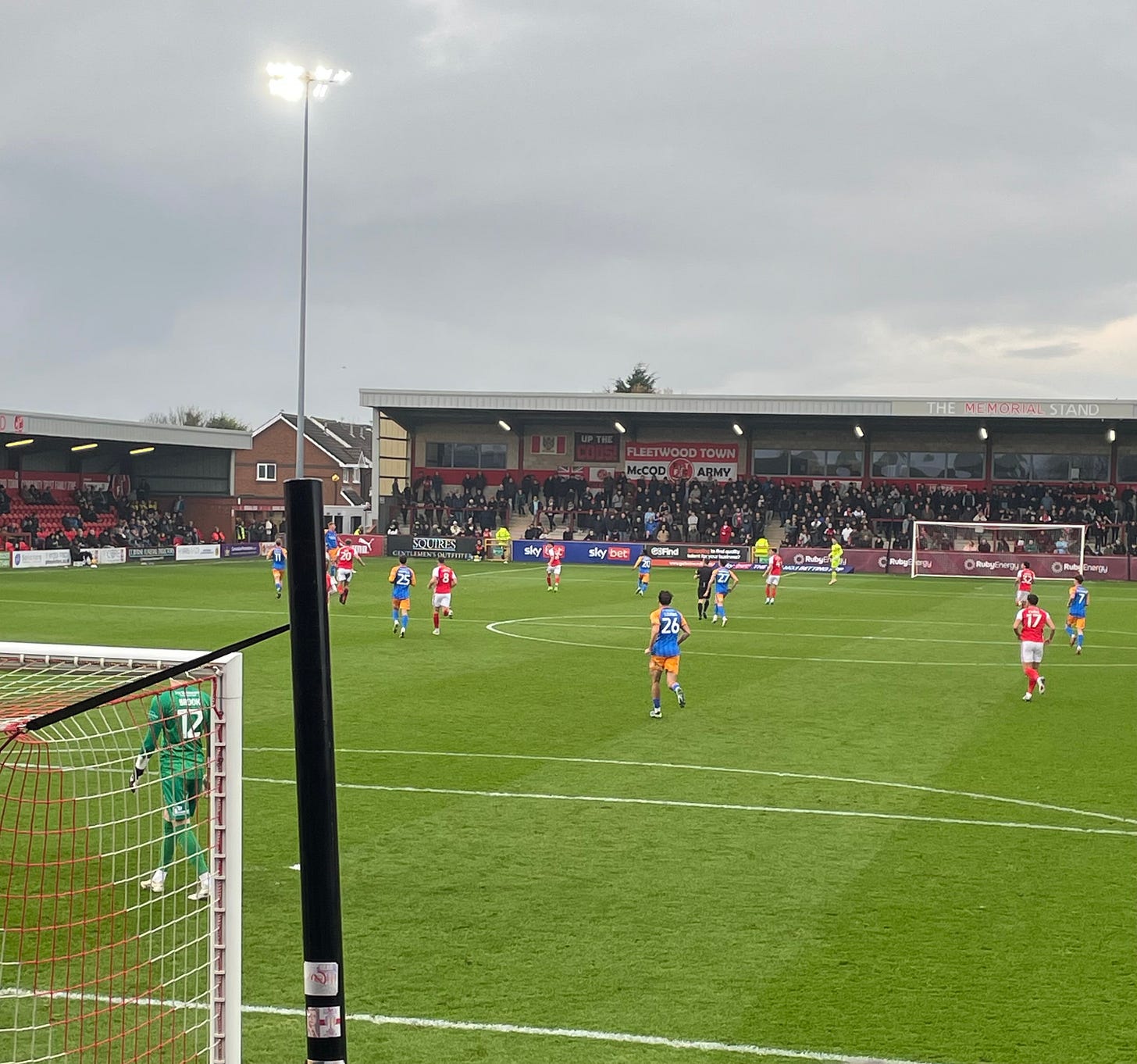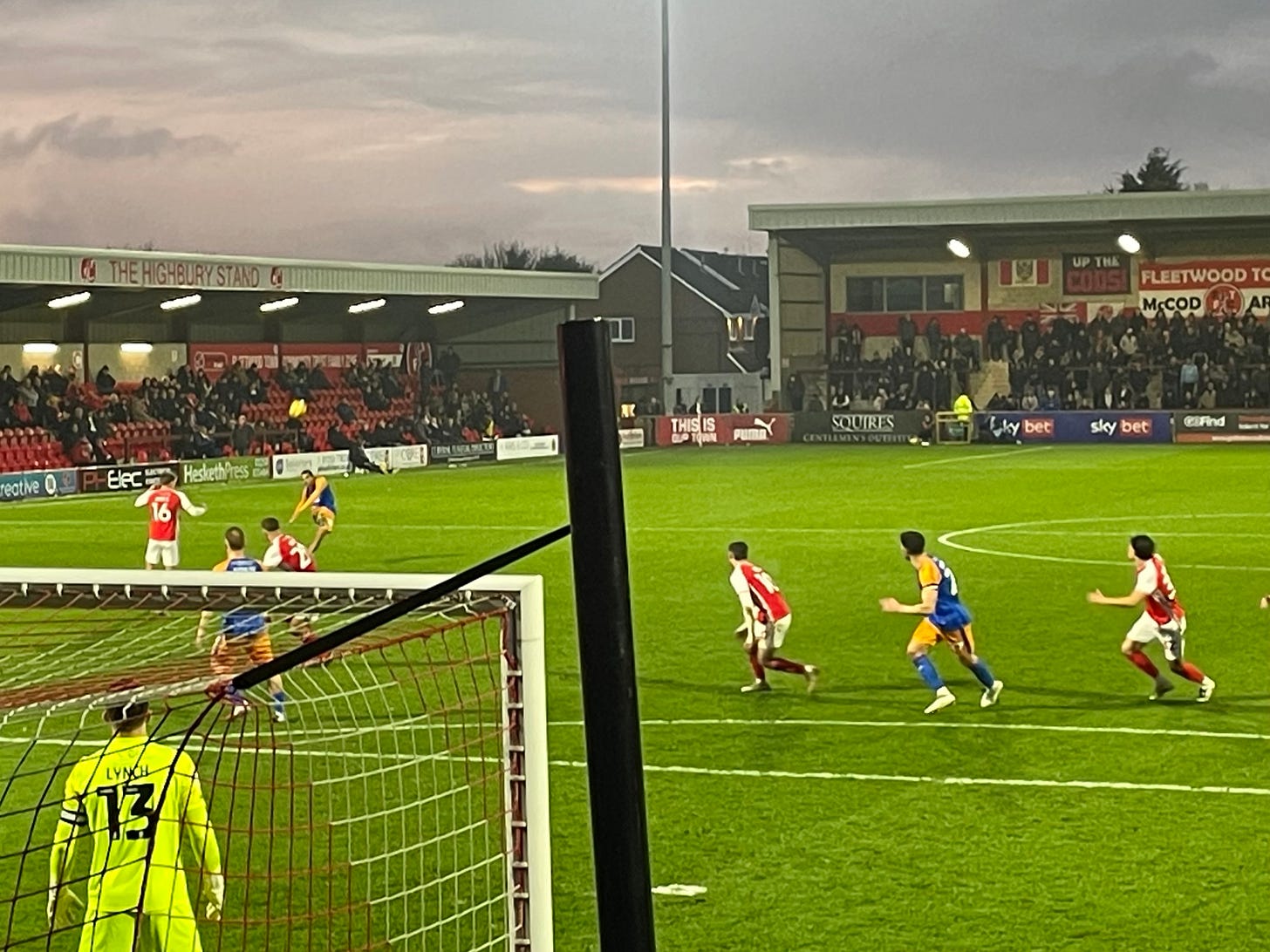 The second half got underway with Salop chasing the goal required to get back into the game. Kabia appeared to have been pushed into the centre forward position, and it did seem to help visitors generate a bit of a threat. From a free kick the ball fell to Clucas who fired in a shot that was narrowly wide. Fleetwood then attacked getting the ball down to be goal line on the left flank, where Mark Helm fed the ball to McCann who cut inside and executed a rather tame looking effort at goal that Stubbs managed to deflect into the roof of the net. Another burst of the Captain Pugwash theme icily cut through my body.