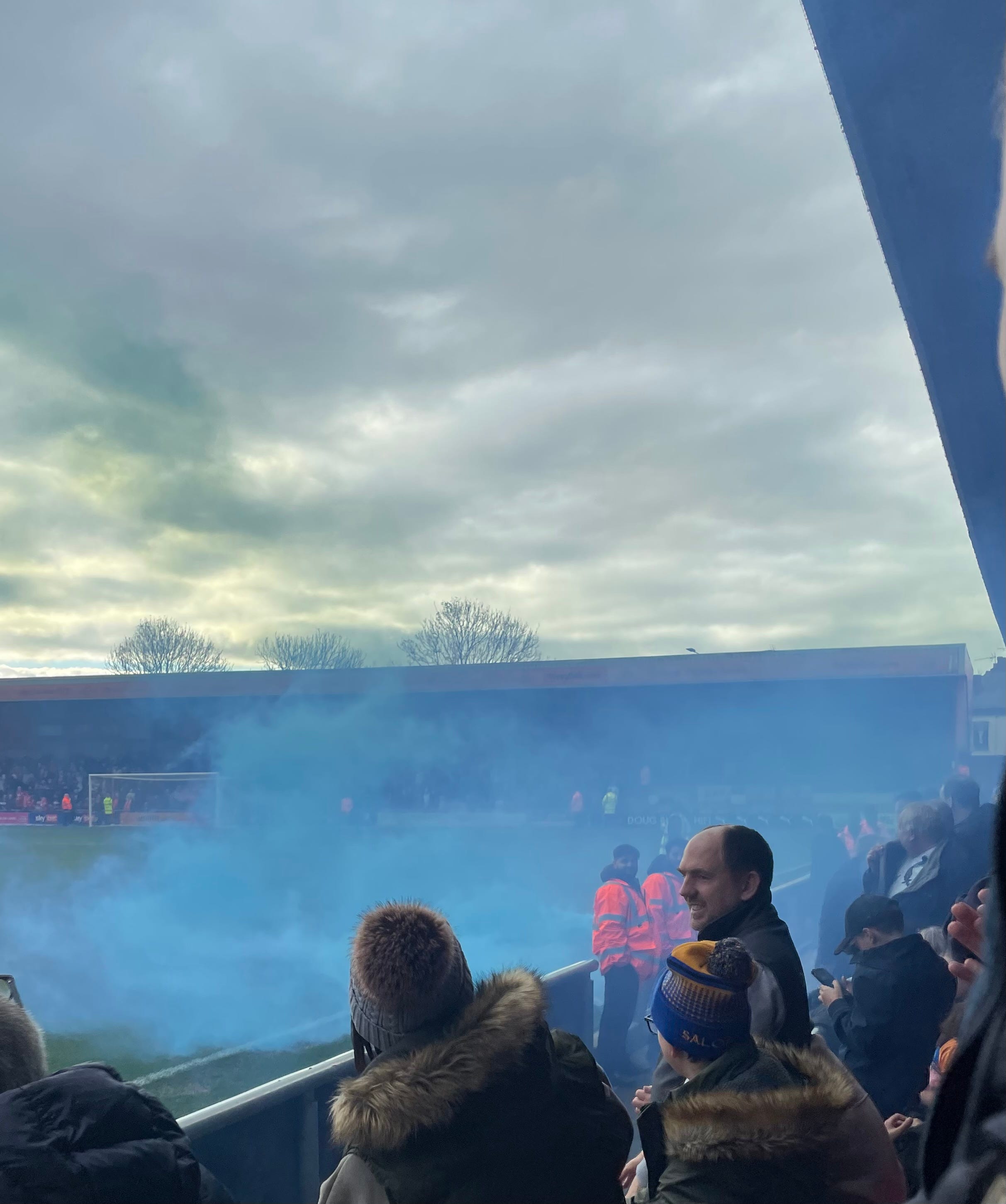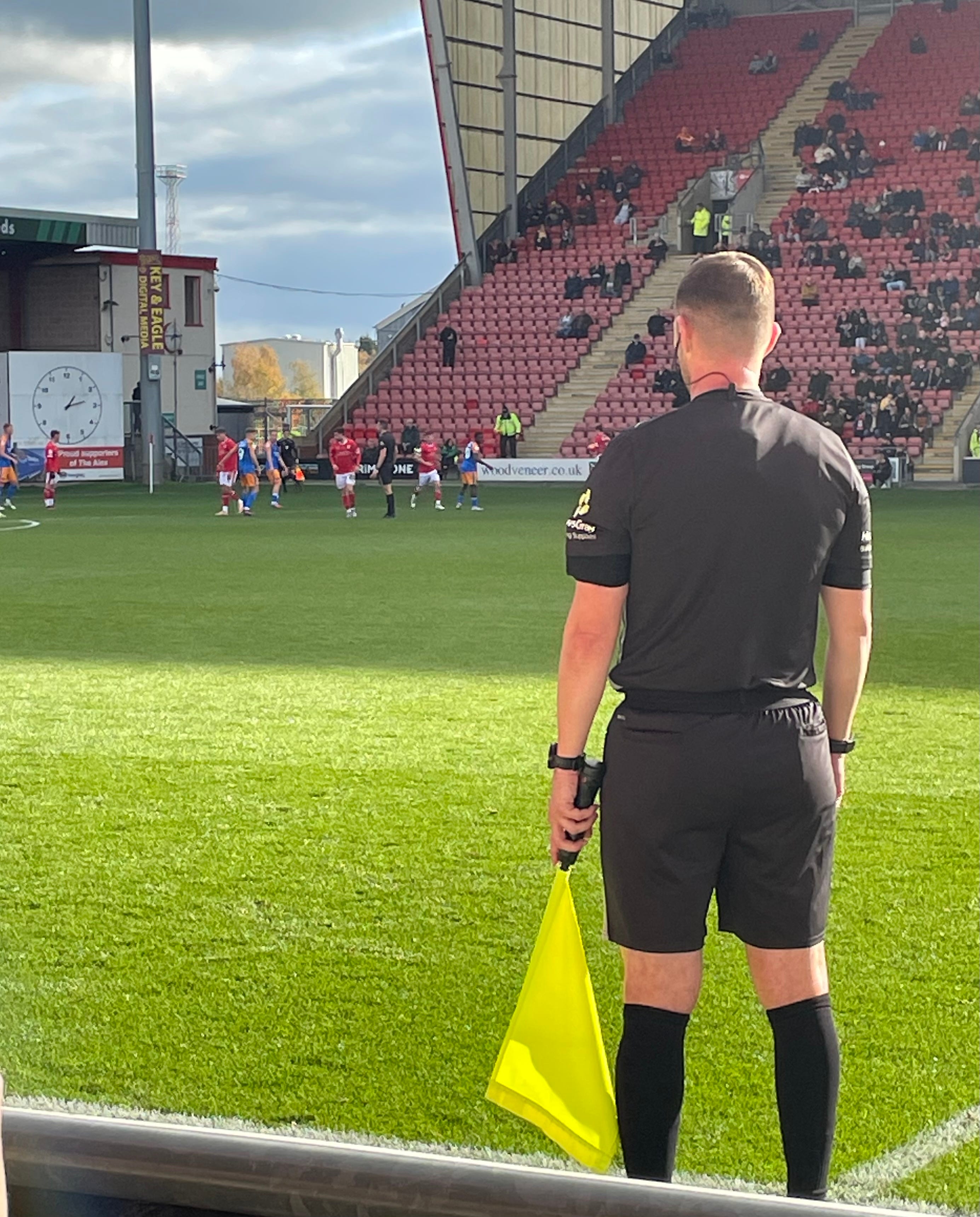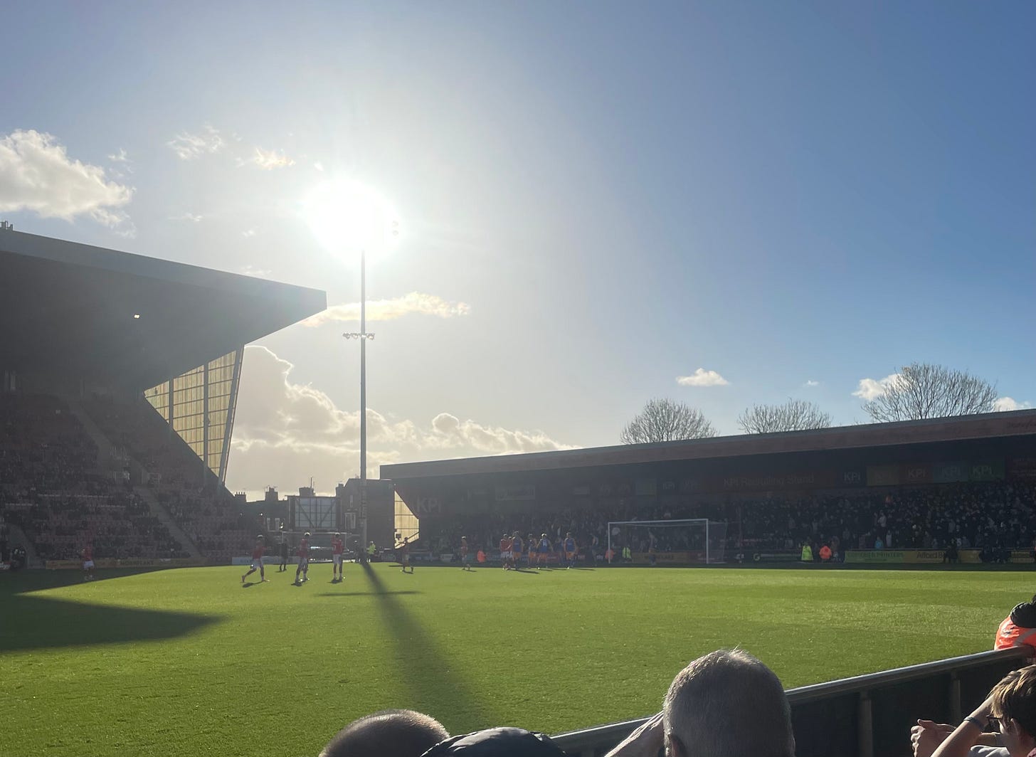 Despite the four sides of the ground having been redeveloped to modern standards, there is still the close to the action feel that characterised the small stadiums of yore. This was very much the case for us as our tickets were for the second row of the away supporters’ seating in the Whitby Morrison stand. Whitby Morrison is not a relative of the ubiquitous Clinton Morrison, but a local company that boasts of being the world’s leading manufacturer of ice cream vans. The fact that this naming rights sponsorship is just over four years into a ninety-nine-year deal suggests the company is not expecting the demand for their vans to melt away any time soon.